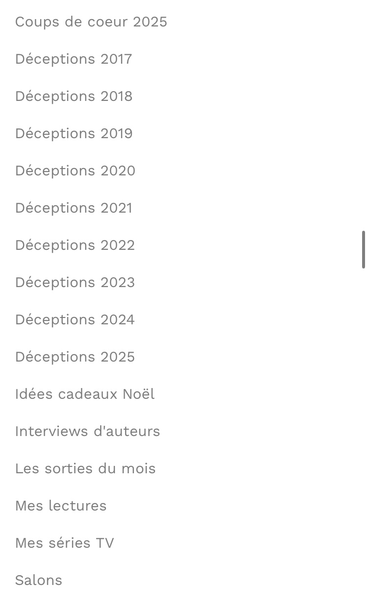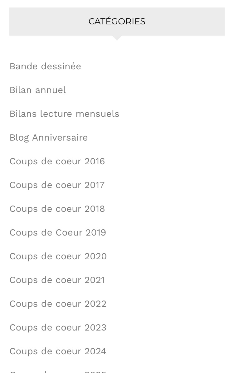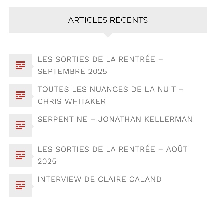 Tout d’abord LA BARRE DE RECHERCHE bien pratique, ensuite LES ARTICLES RECENTS, LES CATEGORIES, LES ARCHIVES mensuelles et LES ETIQUETTES d’auteurs (il suffit de cliquer sur un nom pour retrouver tous les romans chroniqués). Vous voyez, peu importe la porte choisie, c’est l’assurance de faire de belles découvertes !